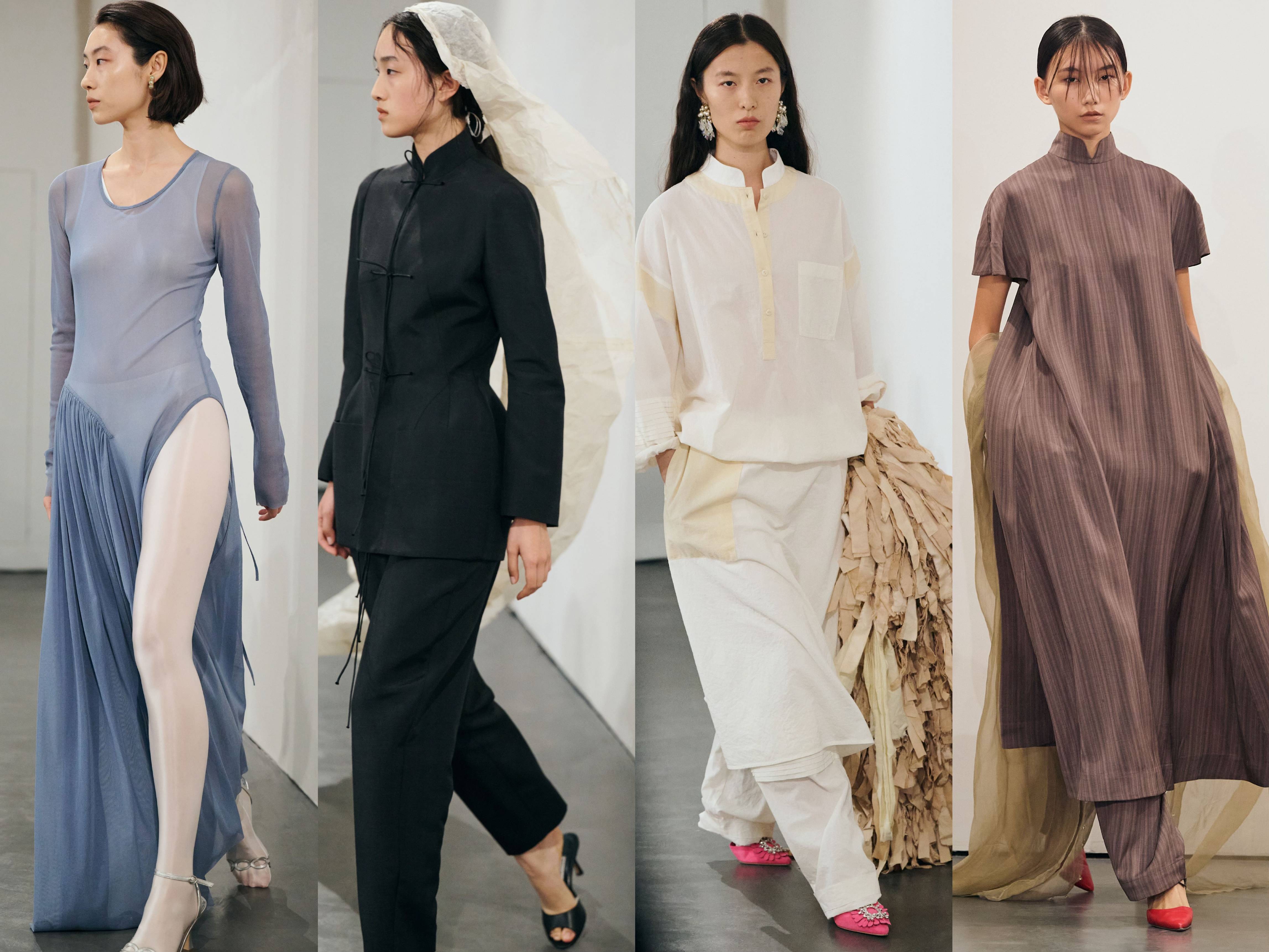 旗袍灵感上装“Lian簾Top”于二五秋冬秀场首次亮相,春夏系列新增幽岩灰日常版本,同质面料奶霜粉“Willow Dress扶柳裙”与其互为增补。宽松廓形的花瓣状牛仔“Hua花Jacket”和“Pit撇Shirt”,继续着SAMUEL GUÌ YANG在现代中式外套和衬衫上的探索。另有多套复古户外风格造型,诠释品牌流动无拘的复合美学。秀场造型均以Manolo Blahnik鞋履搭配,互映点睛。