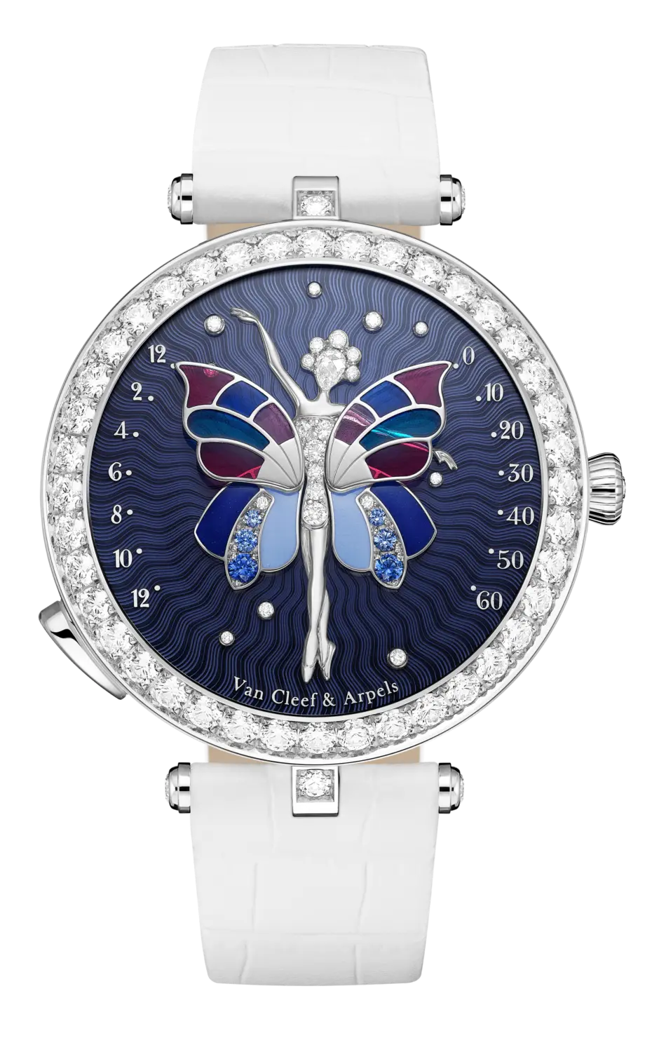 - 白K金表盘、圆形蓝宝石、圆形及玫瑰型切割钻石、白色珍珠母贝、plique-à-jour彩绘玻璃珐琅及grisaille墨彩珐琅、微型彩绘