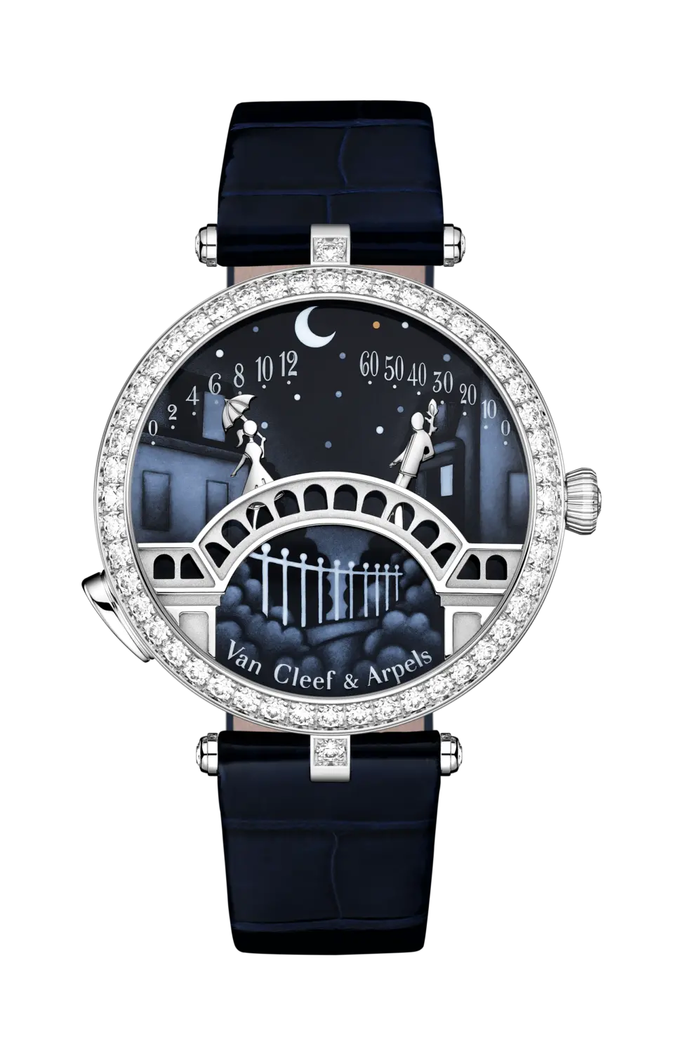 为铭记段段缱绻时光,世家凝铸Midnight Pont des Amoureux男士腕表,借Poetry of Time时间的诗篇,让爱侣的绵绵情意彼此互通,让心动的瞬间跃现42毫米的Midnight表壳上,上演恋人重聚的深情一刻。墨彩珐琅上的动人景致经过重新刻画,彰显现代格调:约会场景换上流露巴黎格调的屋顶、烟囱和石砖路,明月高挂的星空令城内风光更觉柔和恬静。比例略大于女士腕表的一对爱侣,站立于以几何线条和白K金勾勒的拱桥之上。表壳背面亦镌刻璀璨夜景,延续醉人情怀。