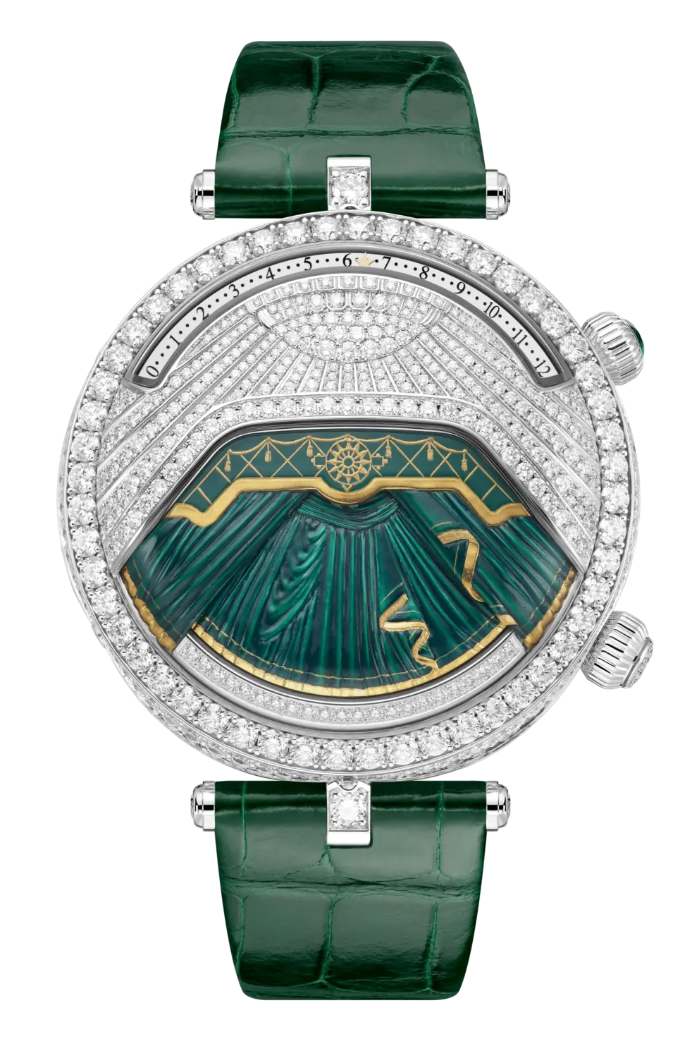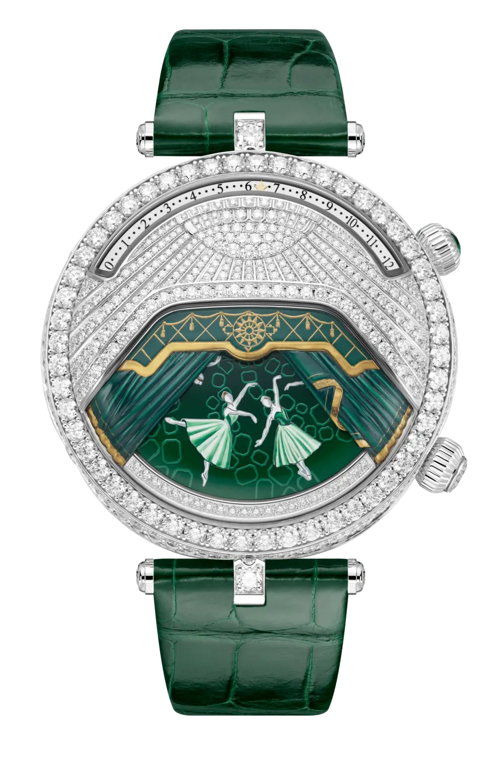 Lady Arpels Ballerines Musicales腕表与这部三幕芭蕾舞剧相呼应,于表盘之上再现真实剧院舞台的景深效果:舞台帷幕以手工雕刻与染色,分别采用绿色、红色和蓝白色调。表盘可根据需要上演芭蕾舞剧场景:帷幕缓缓拉开,露出五位芭蕾舞伶以及曾为乔治·巴兰钦带来灵感的宝石。舞伶身着的芭蕾舞裙和色彩分别代表不同的芭蕾学派——法兰西学派、美国学派和俄罗斯学派。